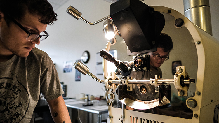 “We wanted to know what made that coffee so good,” says Marsh, “and we learned that you could roast coffee in those little air popcorn poppers people use at home. We went to Goodwill, bought one for $1, and ordered five pounds of green coffee beans off the internet. Basically, we were on a college budget, wanted good coffee, couldn’t afford to buy it at $20 a bag, and figured we’d save money by roasting our own.”