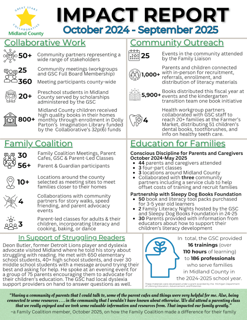 Advocacy and collaboration remain at the heart of Midland’s Great Start Collaborative. It’s a reminder that supporting children isn’t just an educational issue; it’s a community-wide investment. From strengthening parents’ confidence to equipping teachers with tools and resources, every effort contributes to a healthier, more hopeful future.