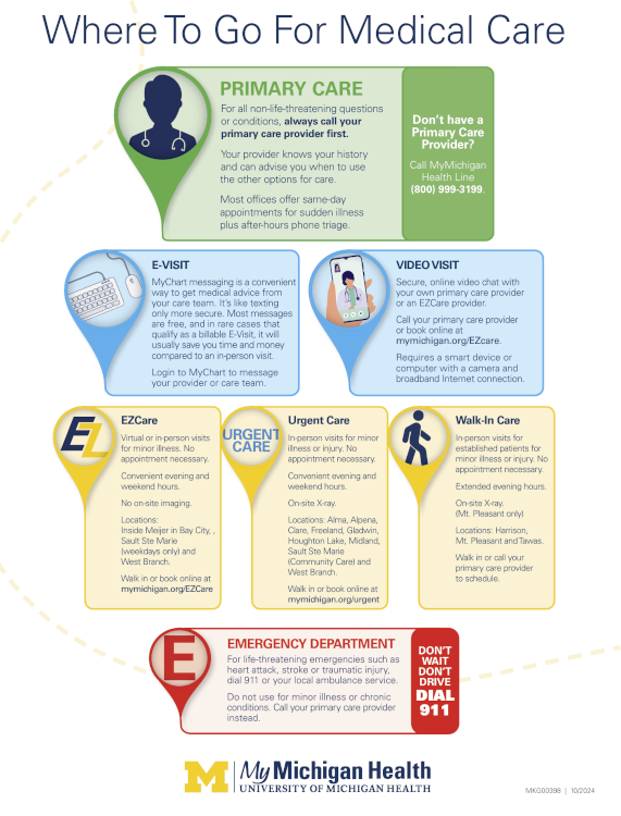 This is why it’s critical for the health of the community at large that people seek the correct avenue for care when they have health concerns – whether that’s the Emergency Department, Urgent Care, EZCare, or their Primary Care office – says Karen Solomon, MyMichigan Health Park Bay Emergency Manager.